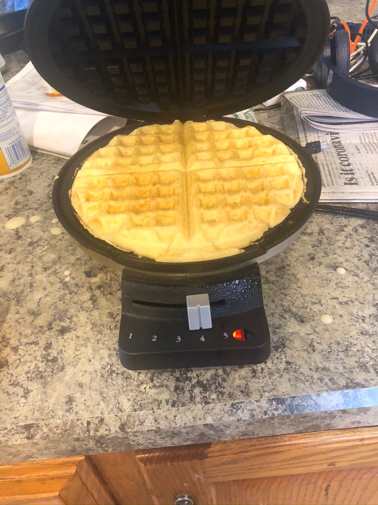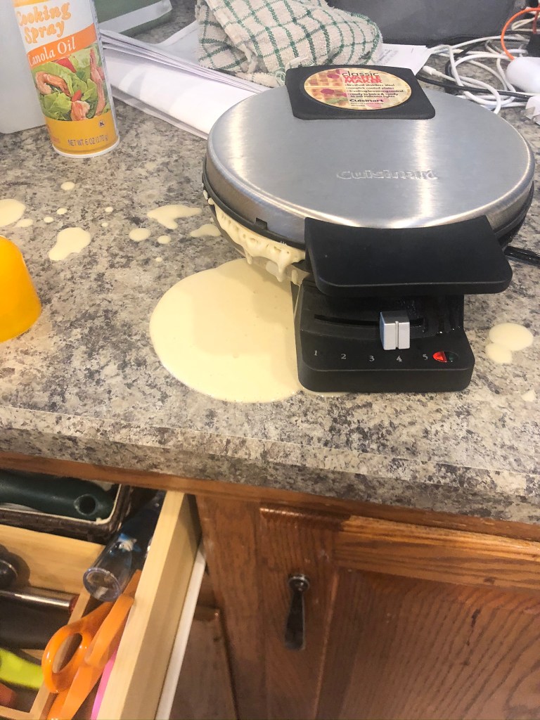 After throwing out the pancake mix from 2011 (yes, Gigi, old food does actually go bad), and googling an easy recipe (btw 3 cups of milk is way to much, so I won’t use using that recipe again), I finally got some pretty good waffles and only made a slight mess which I consider a success!